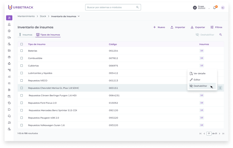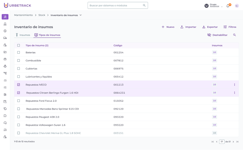Puedes deshabilitar y volver a habilitar un tipo de insumo de manera individual o masiva. Al deshabilitar, los insumos que estén asociados al tipo de insumo no se mostrarán al gestionar OMs.