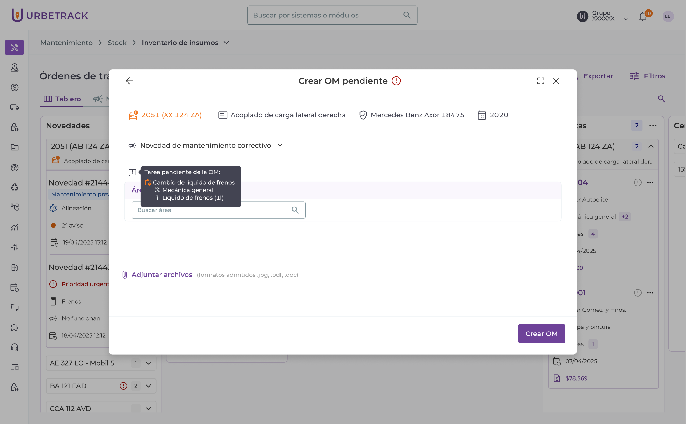 Creación de OM pendiente a partir de una novedad generada luego de resolver una OM con una tarea pendiente. Mostrará como sugerencia la tarea, el área de trabajo y el insumo que se habían consignado en la OM anterior.