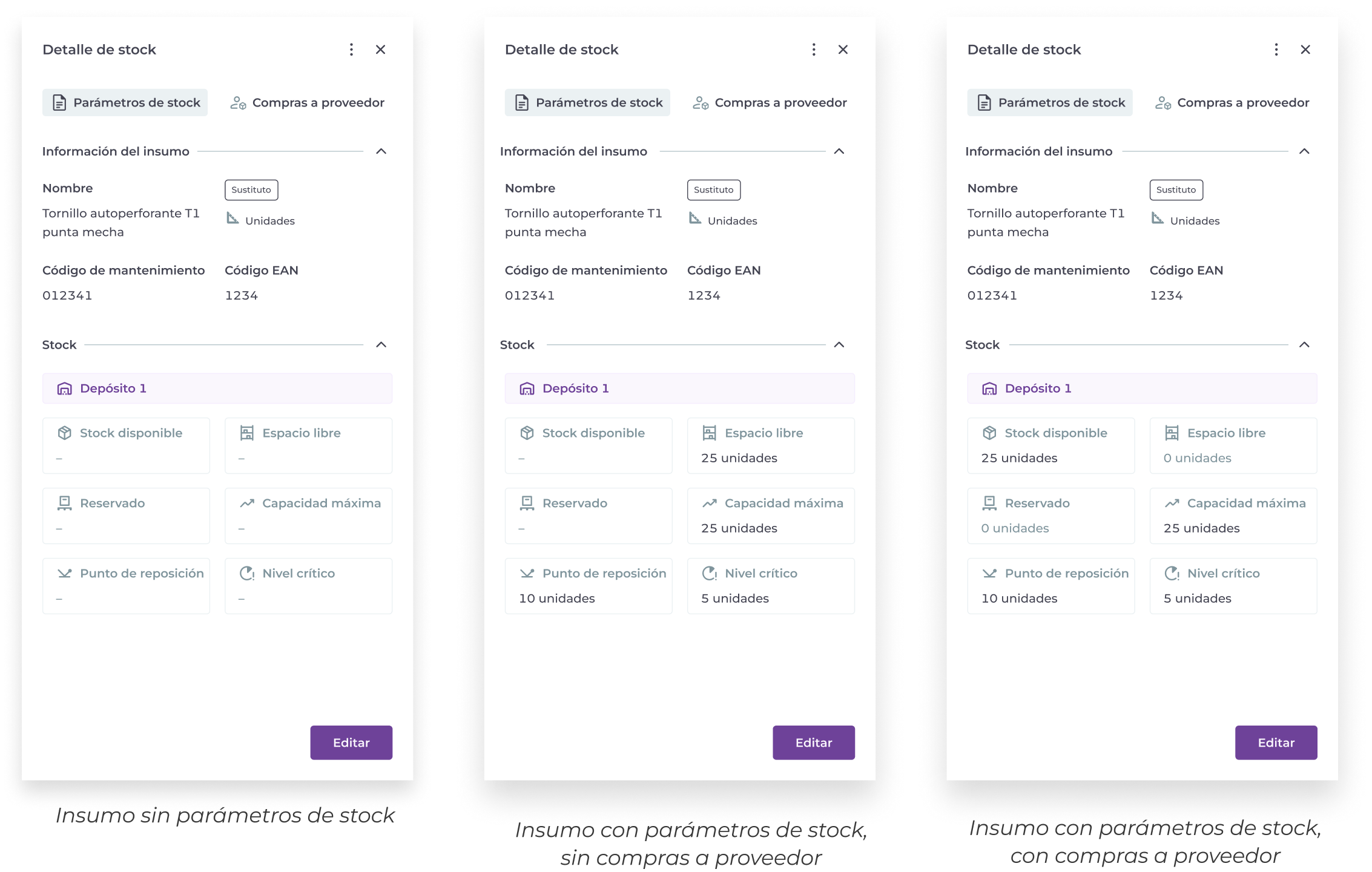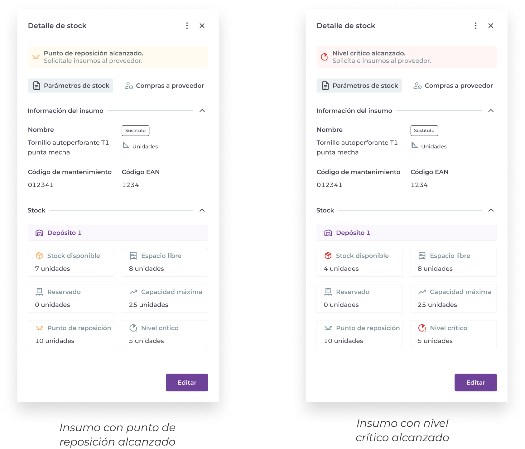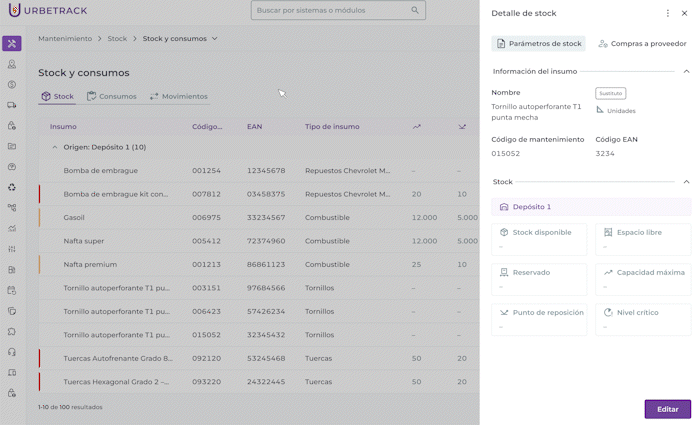 Se pueden asignar y editar parámetros de stock a cada insumo.