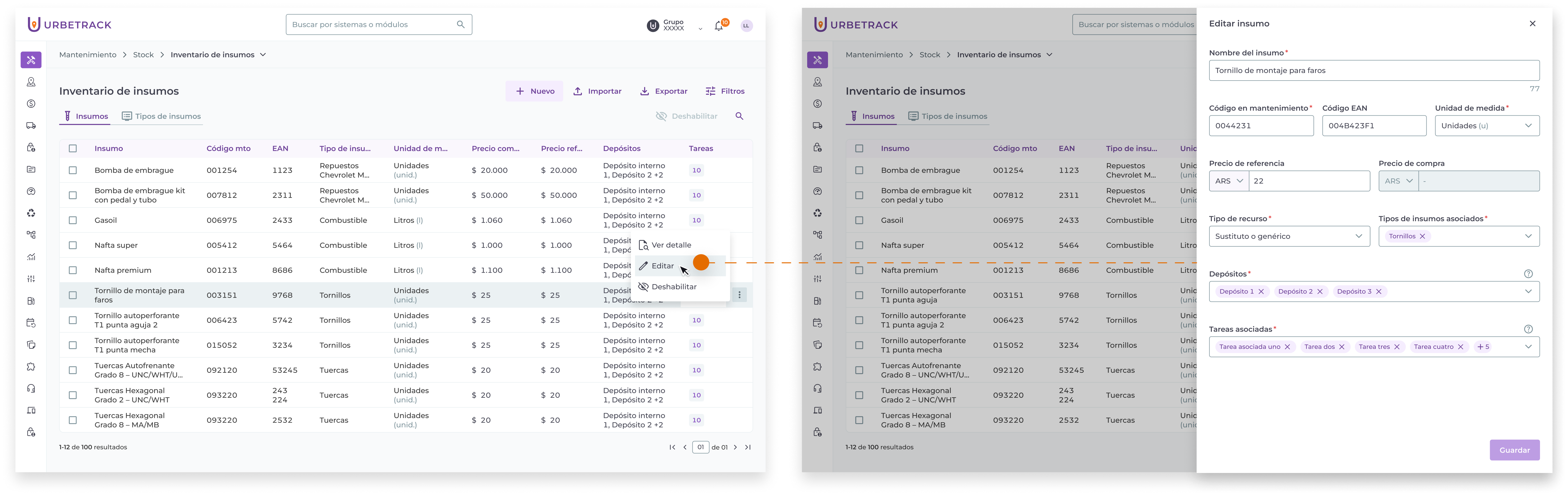 Importante: no podrás quitar depósitos que tengan stock del insumo que se está editando. Tampoco podrás quitar depósitos ni tareas que estén asignadas a OMs activas con el insumo que se está editando.
