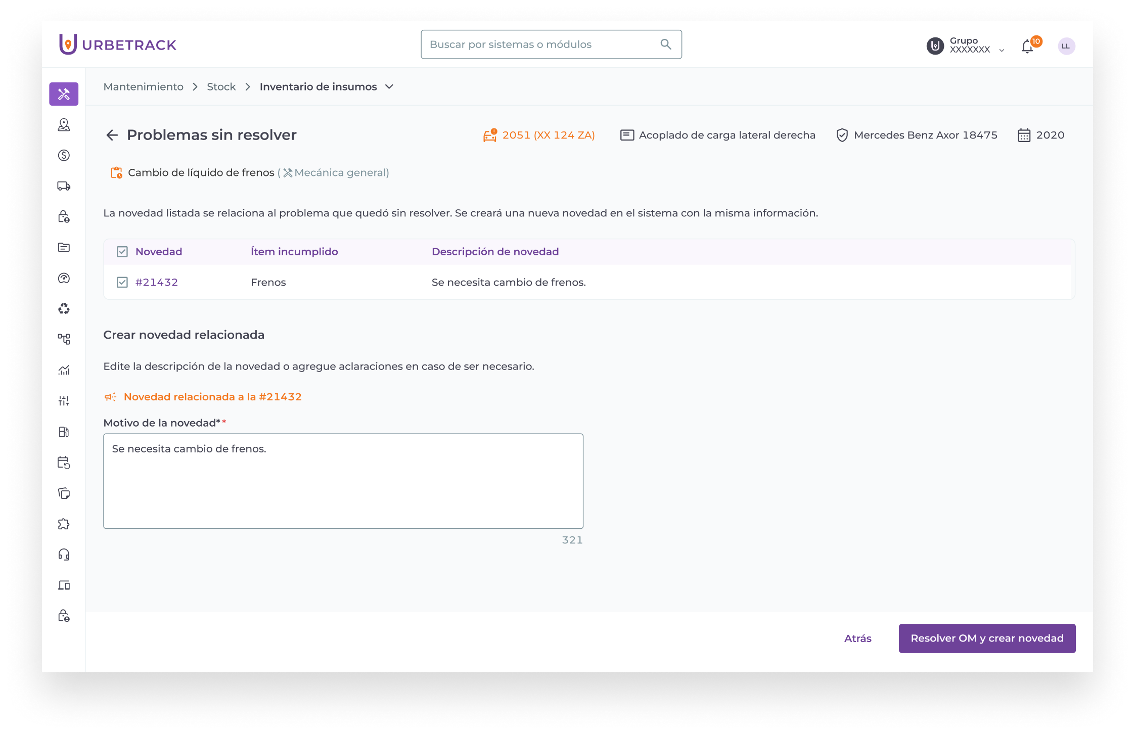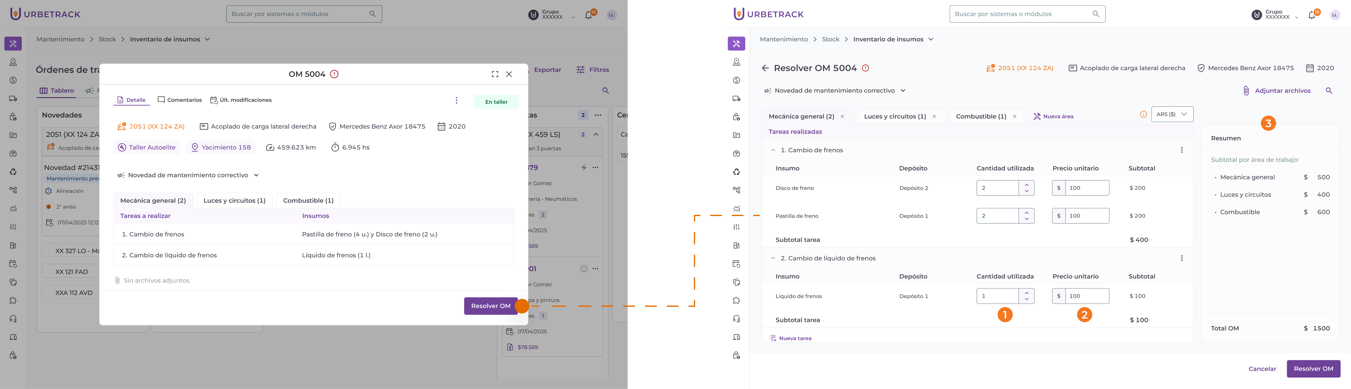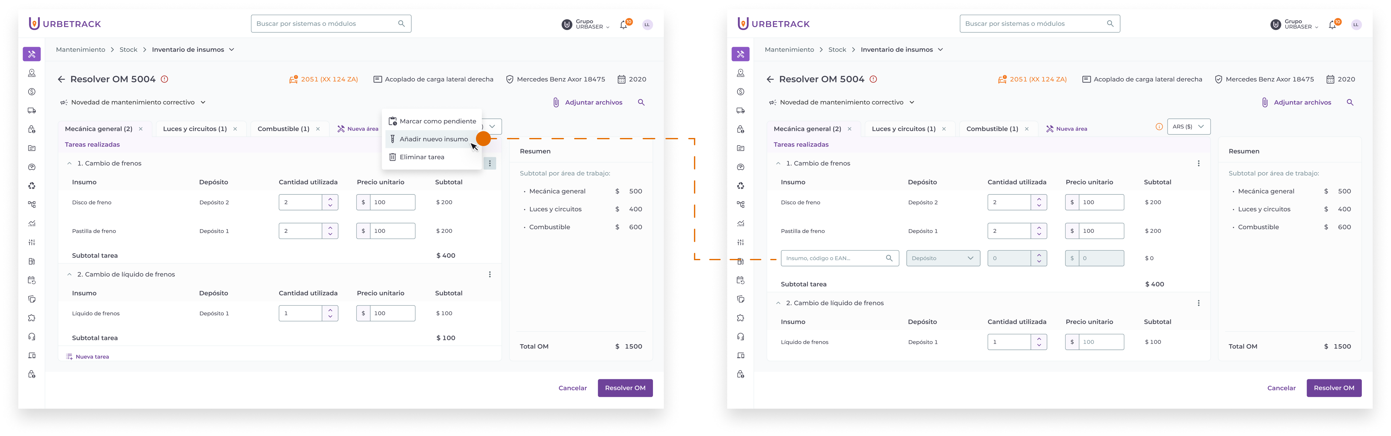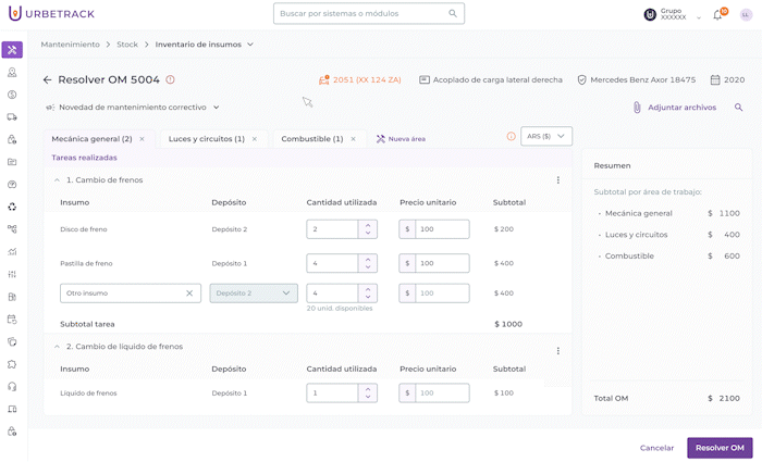 Importante: Si se añaden nuevos insumos al momento de resolver una OM, la tarea no podrá luego marcarse como “pendiente”.