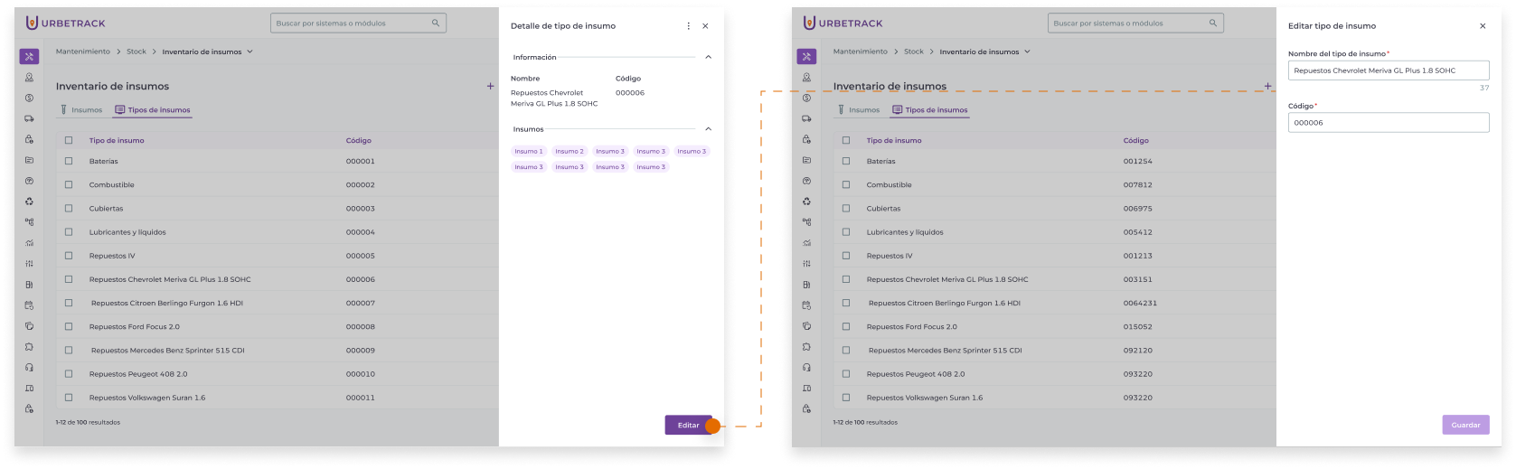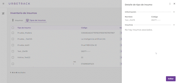 Puedes editar un tipo de insumo de dos maneras: Desde el panel lateral con detalle o desde el editor de la tabla.