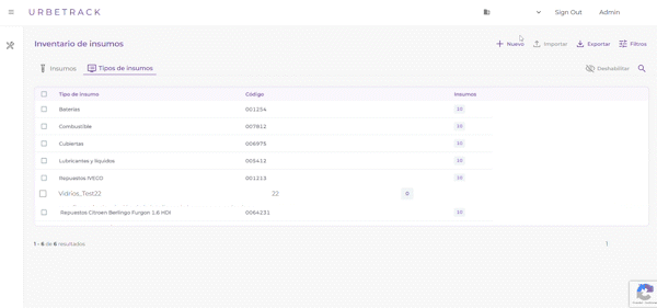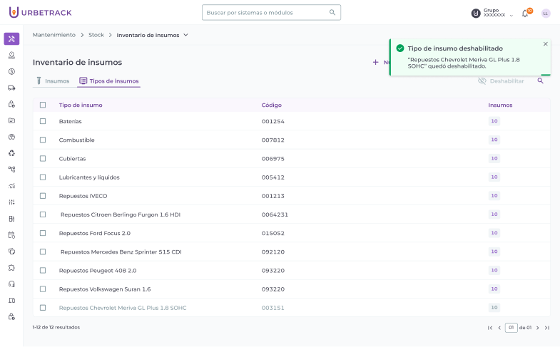Importante: no podrás deshabilitar tipos de insumos que tengan insumos asignados a OMs activas.