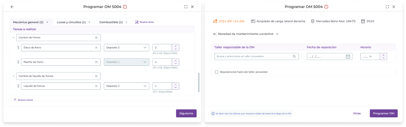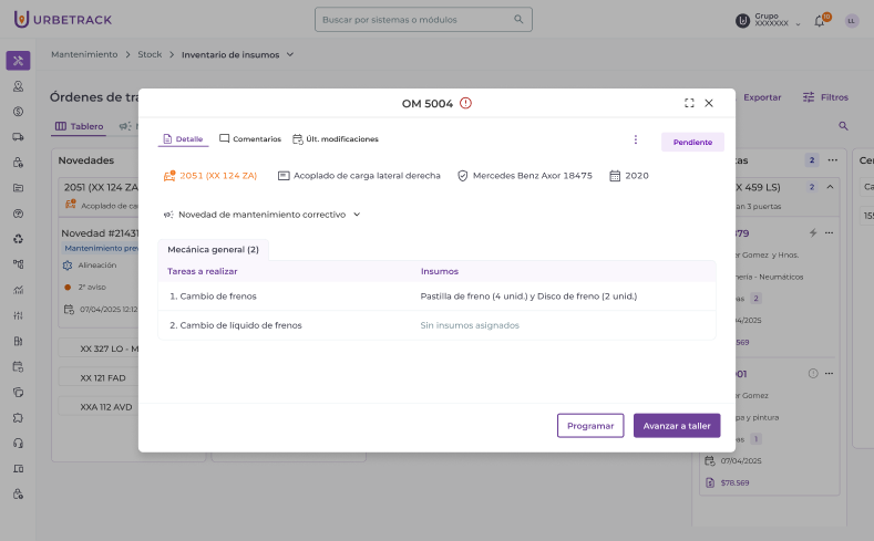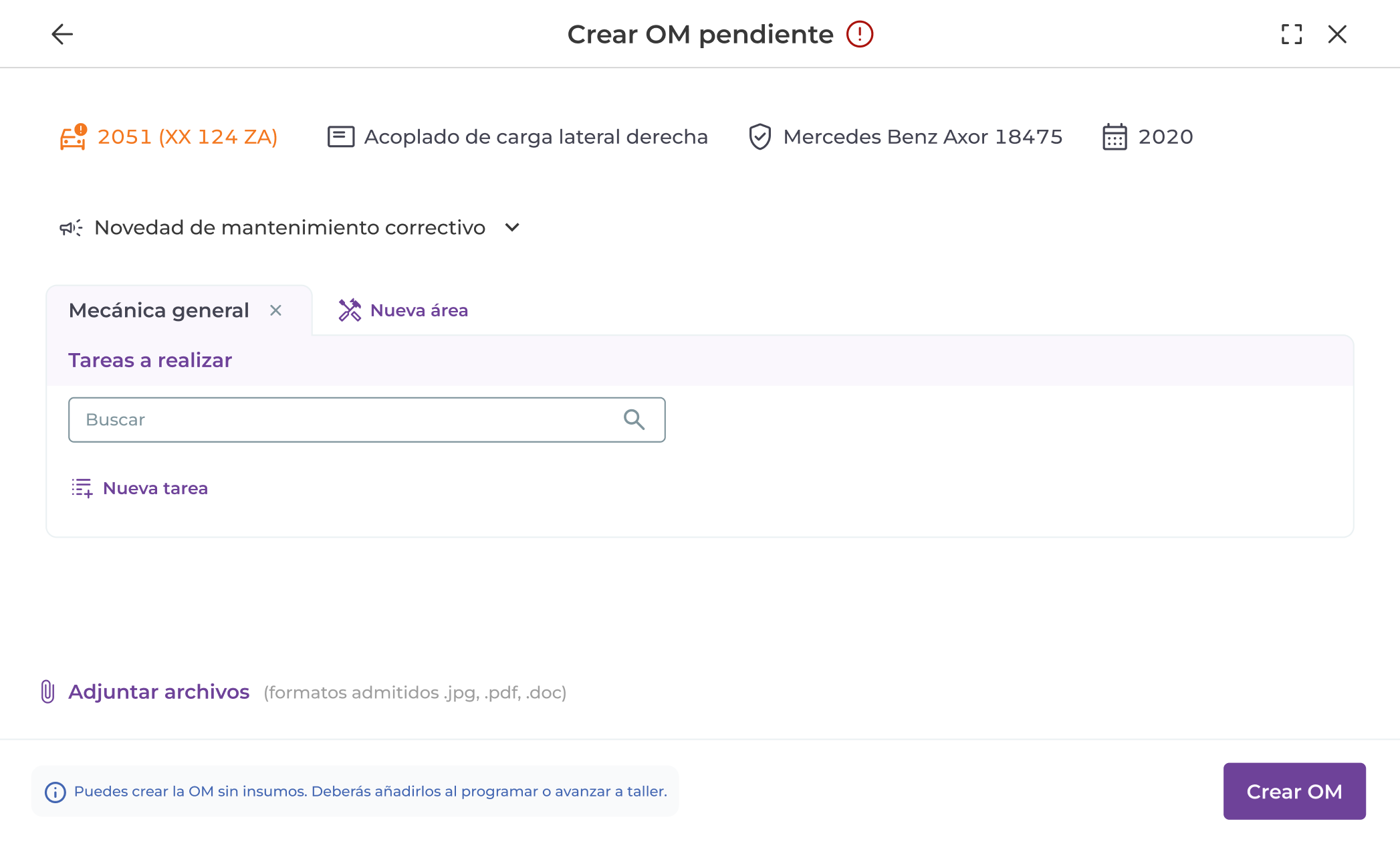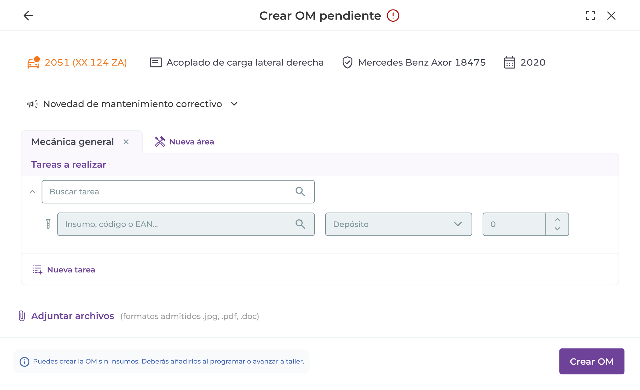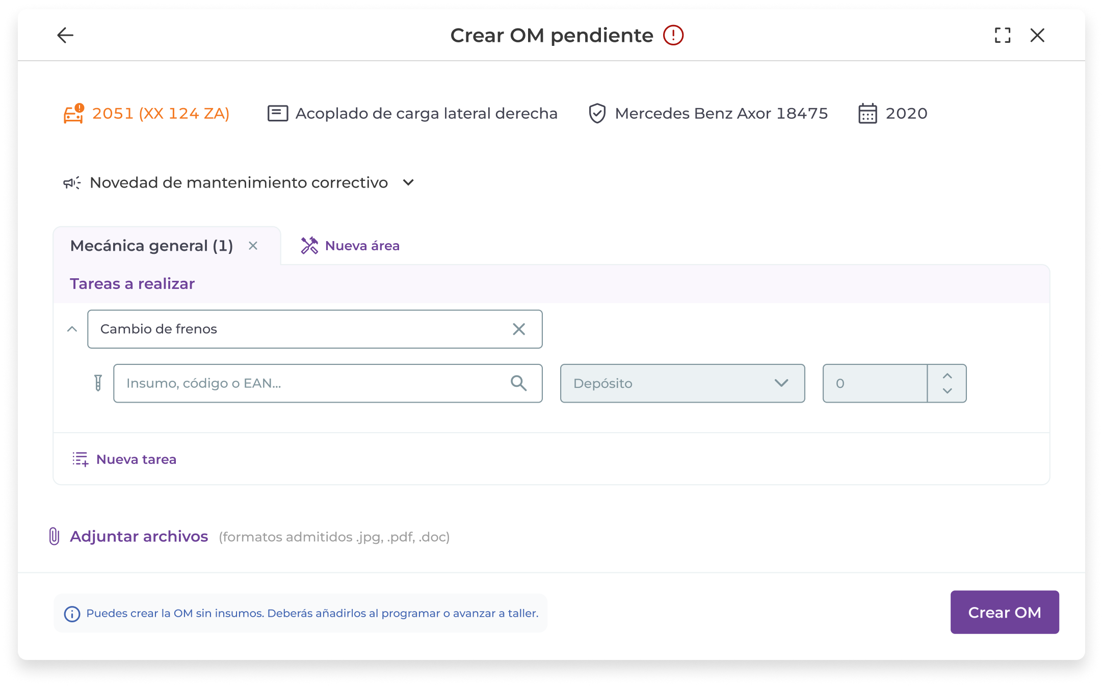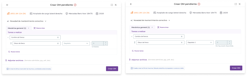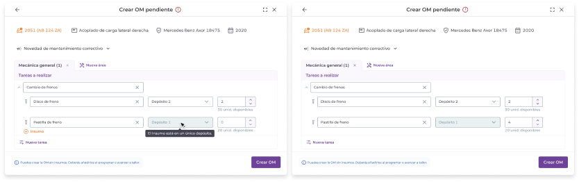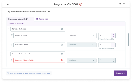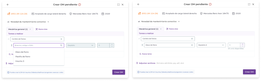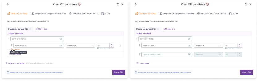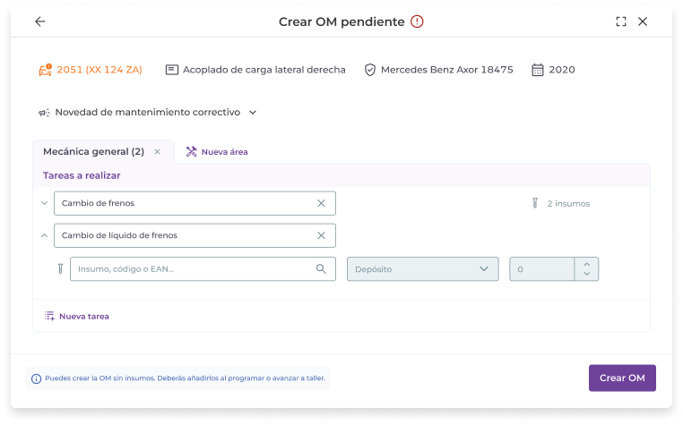 Al crear una OM pendiente puedes dejar insumos sin asignar. Es decir, puedes elegir tareas a realizar sin asignarle insumos. Luego, al “Programar” o al “Avanzar a taller” la OM, el sistema requerirá que se asignen los insumos de forma obligatoria.