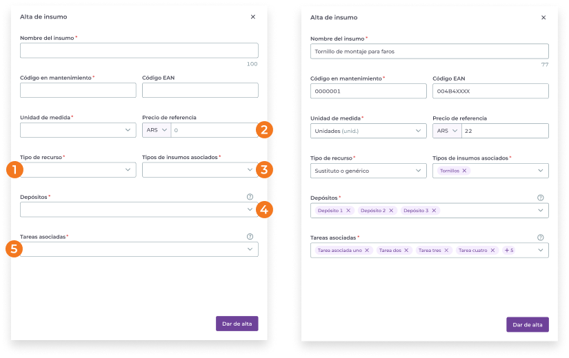 4. Seleccionador de los depósitos en los que se alojará el insumo. (El depósito debe estar dado de alta previamente desde el módulo de “Depósitos”).