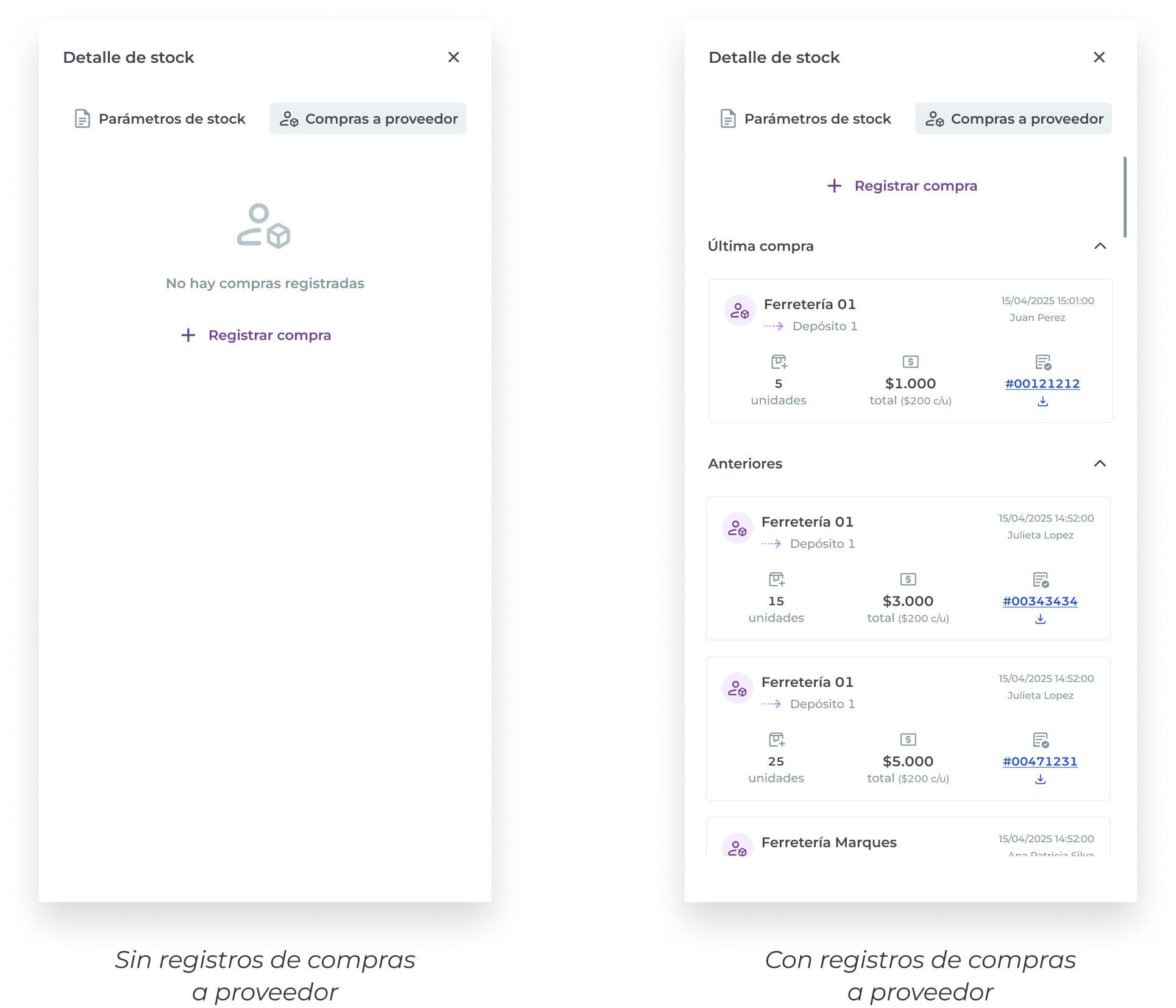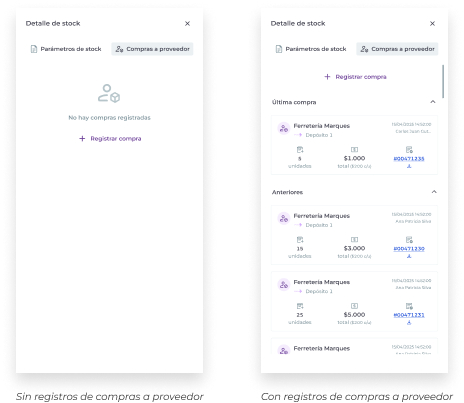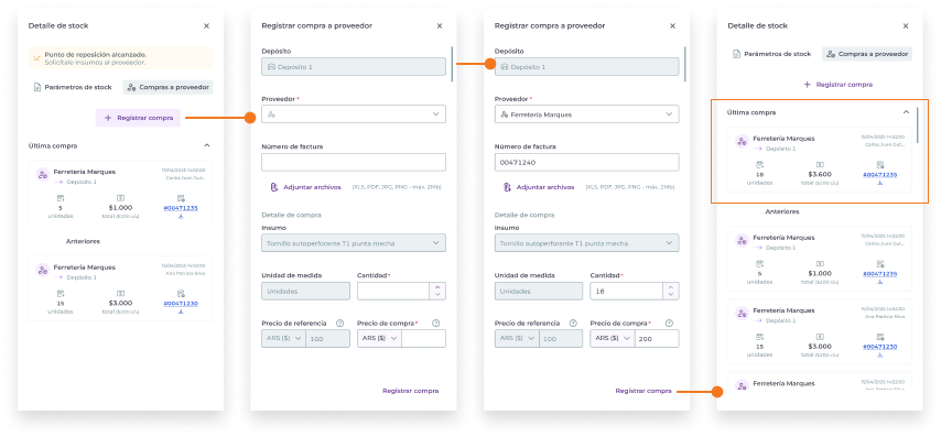 Para registrar una compra a proveedor haz click en + registrar compra y completa los datos. Puedes acceder desde el detalle de stock de un insumo o desde el las acciones del listado general.