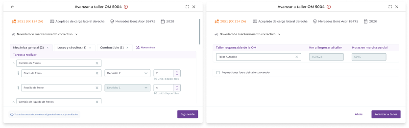 Ejemplo: avanzar a taller una OM con insumos y cantidades pendientes de seleccionar.